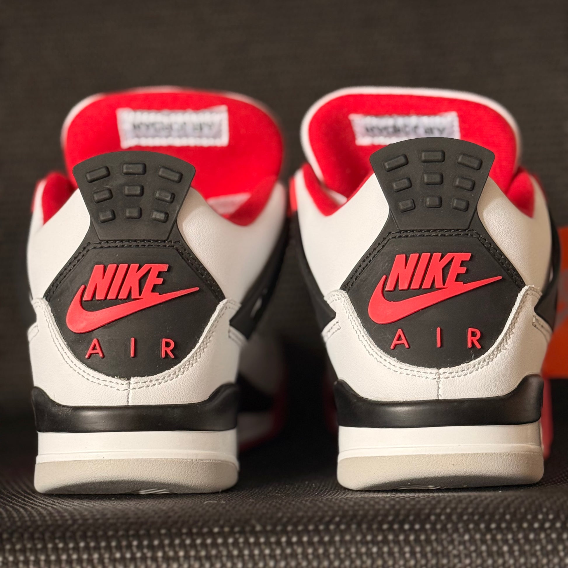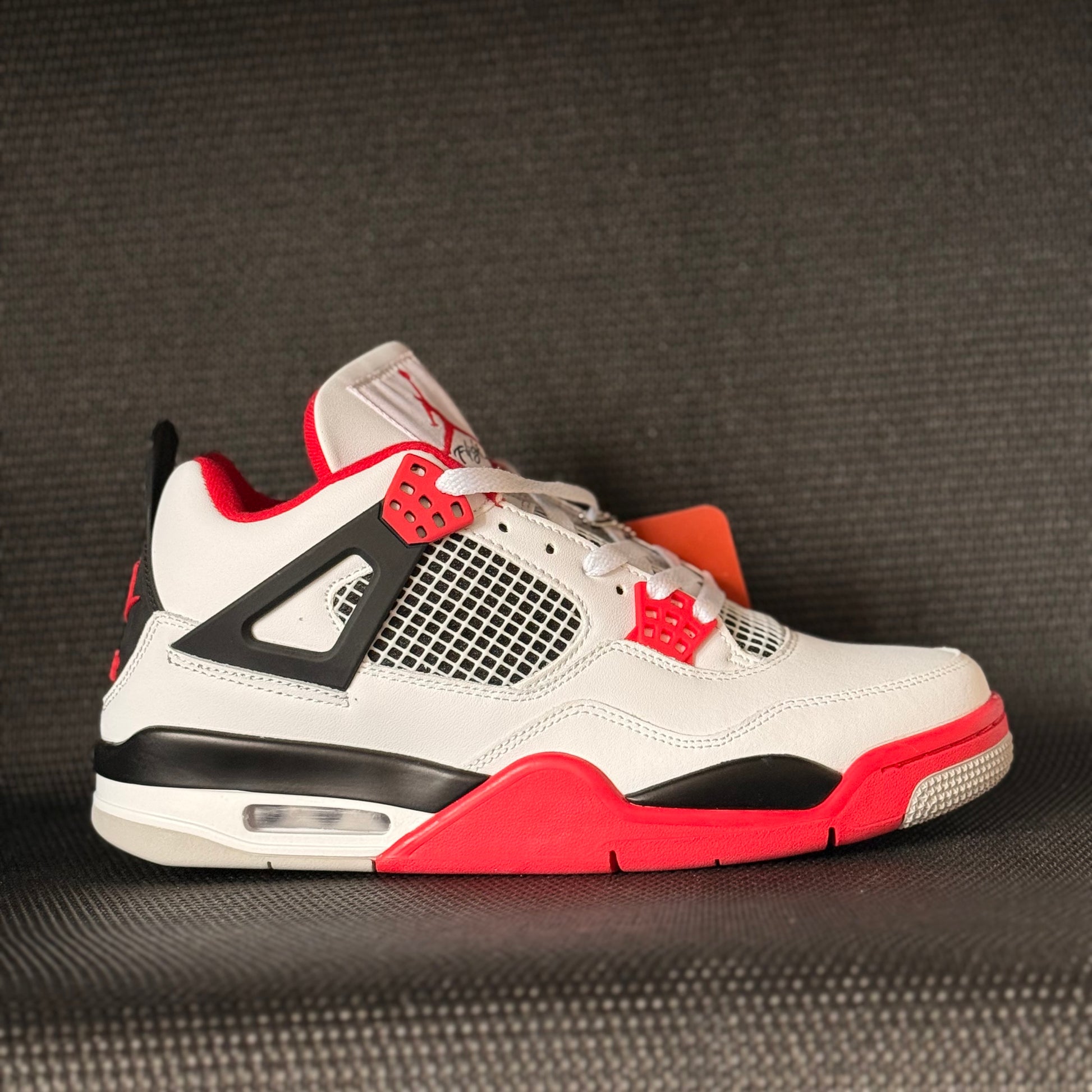 "The Air Jordan 4 Retro OG 'Fire Red' offers a clean, classic look with its white leather upper and bold Fire Red accents. Featuring a supportive midsole and heel with an OG Nike Air logo, this shoe also offers the signature Jordan design elements of mesh/netting and a Jumpman + "Flight" script patch on the tongue. Step into style and comfort with this iconic silhouette."