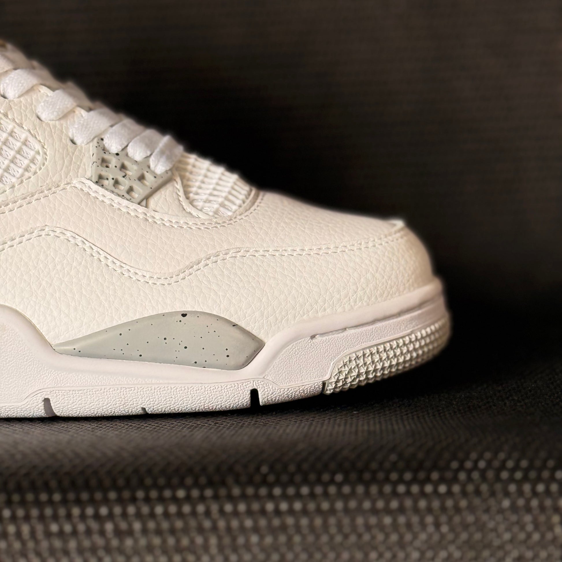 Step up your sneaker game with the Air Jordan 4 Retro "White Oreo". Made with soft tumbled leather and cement-speckled grey accents, this shoe exudes luxury and style. Breathable mesh panels and a visible Air unit offer comfort, while the classic Jordan 4 wings and metallic Jumpman logo add a touch of iconic flair.