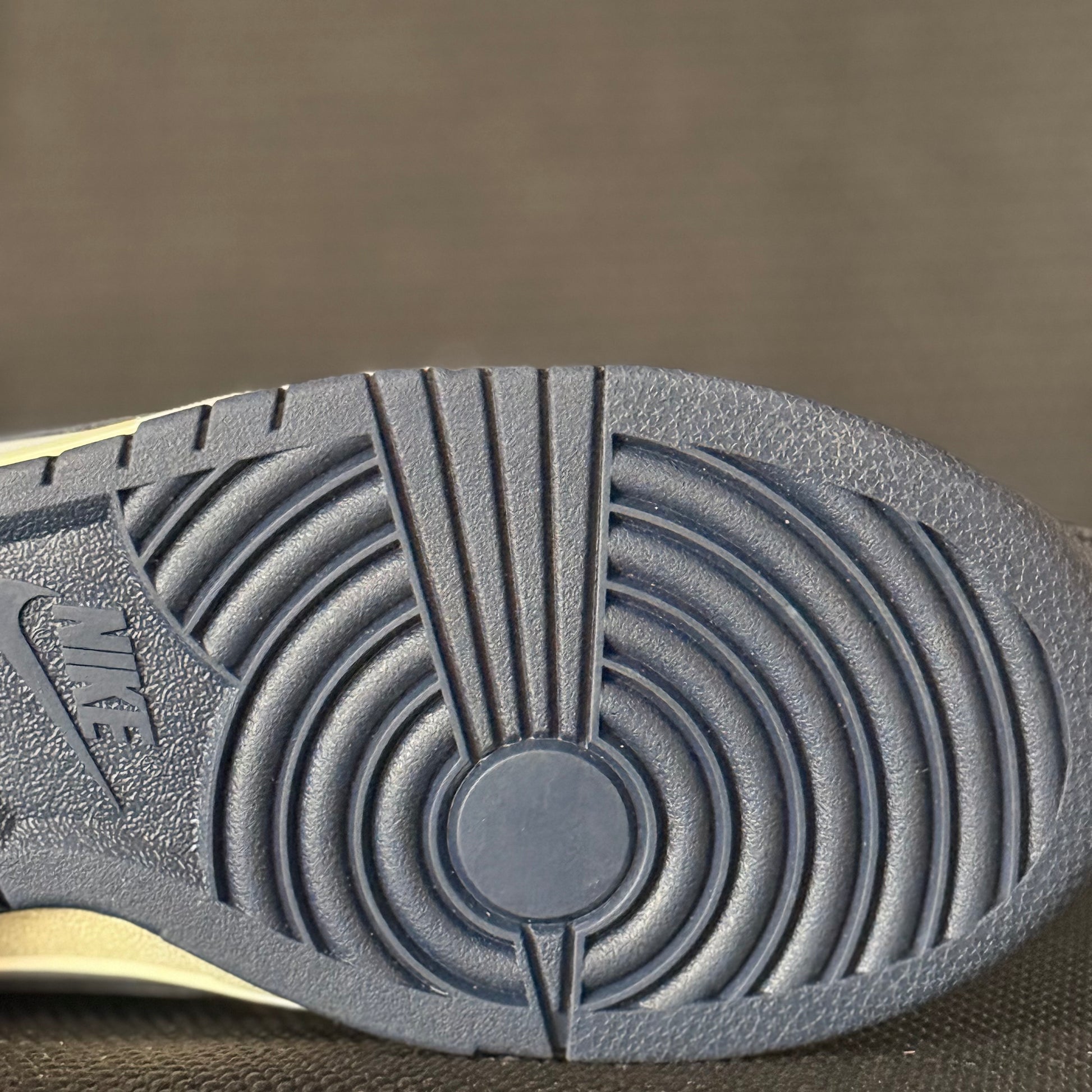 This Nike Dunk Low showcases a premium white leather base paired with deep navy overlays for a bold, classic two-tone look. The aged-cream midsole adds a vintage touch, giving the shoe a retro feel straight out of the box. Navy accents on the outsole, lining, and Swoosh create strong contrast, while traditional Dunk details—perforated toe box, padded collar, and durable rubber sole—complete the iconic design. Clean, timeless, and easy to style, this pair blends modern wearability with old-school character.