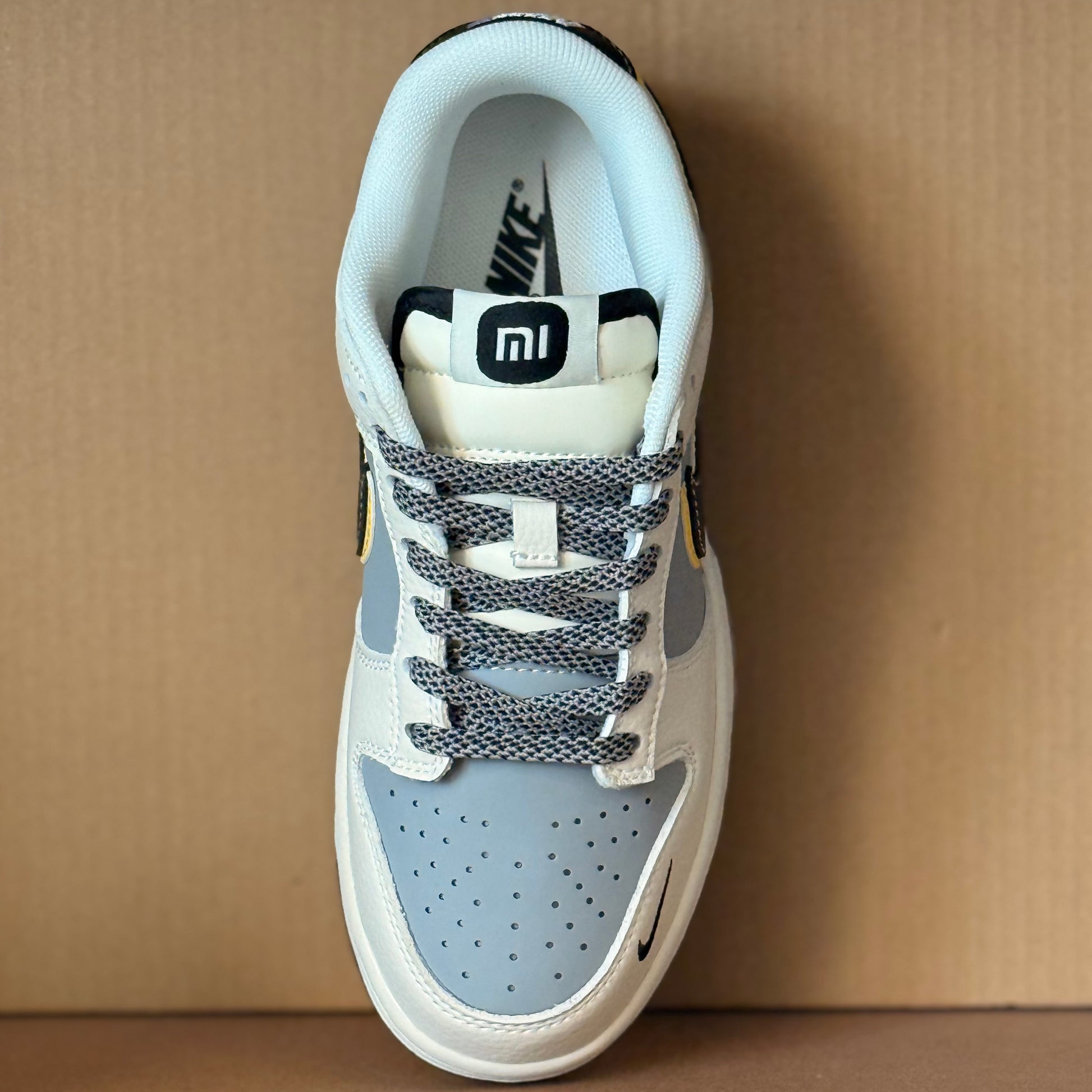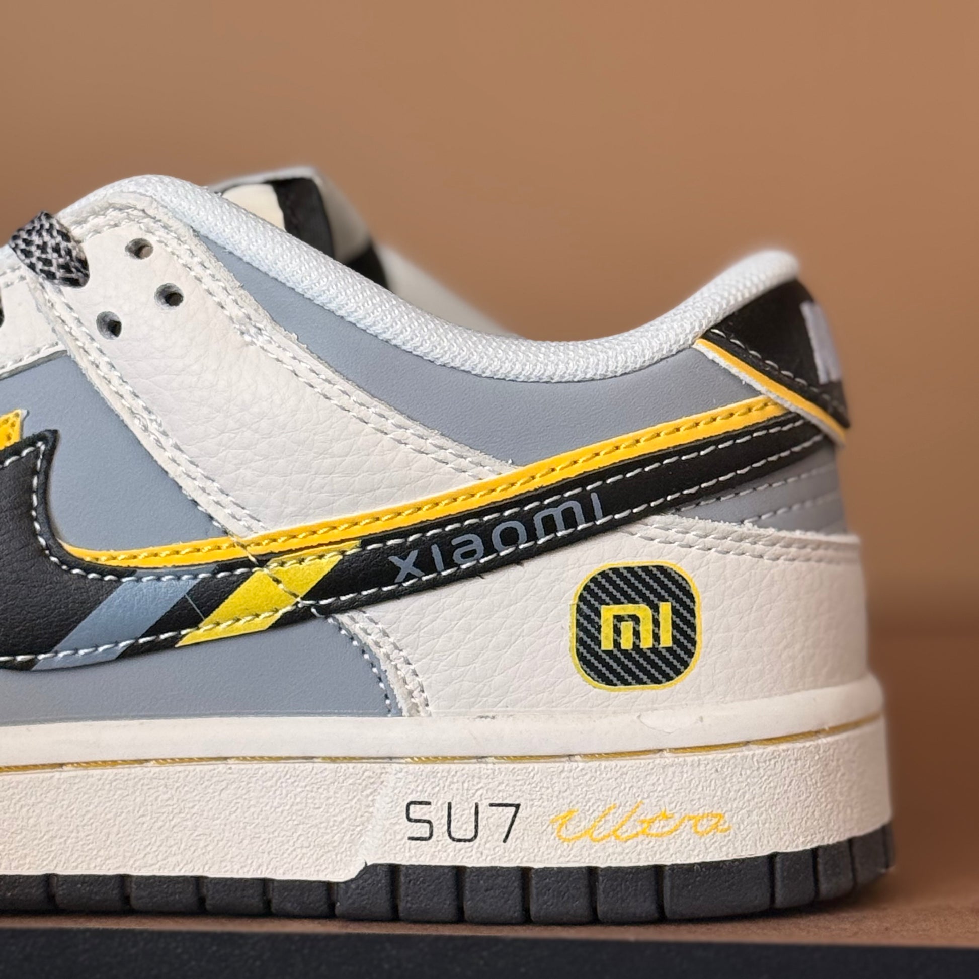 Introducing the Xiaomi SU7 Dunk Low (Custom), a blend of tech-inspired style and classic silhouette. Premium leather overlays in cream and grey are accented by bold black and yellow details, emulating Xiaomi's signature aesthetic. The modified swoosh design and multiple Mi branding add a unique touch to this must-have shoe.